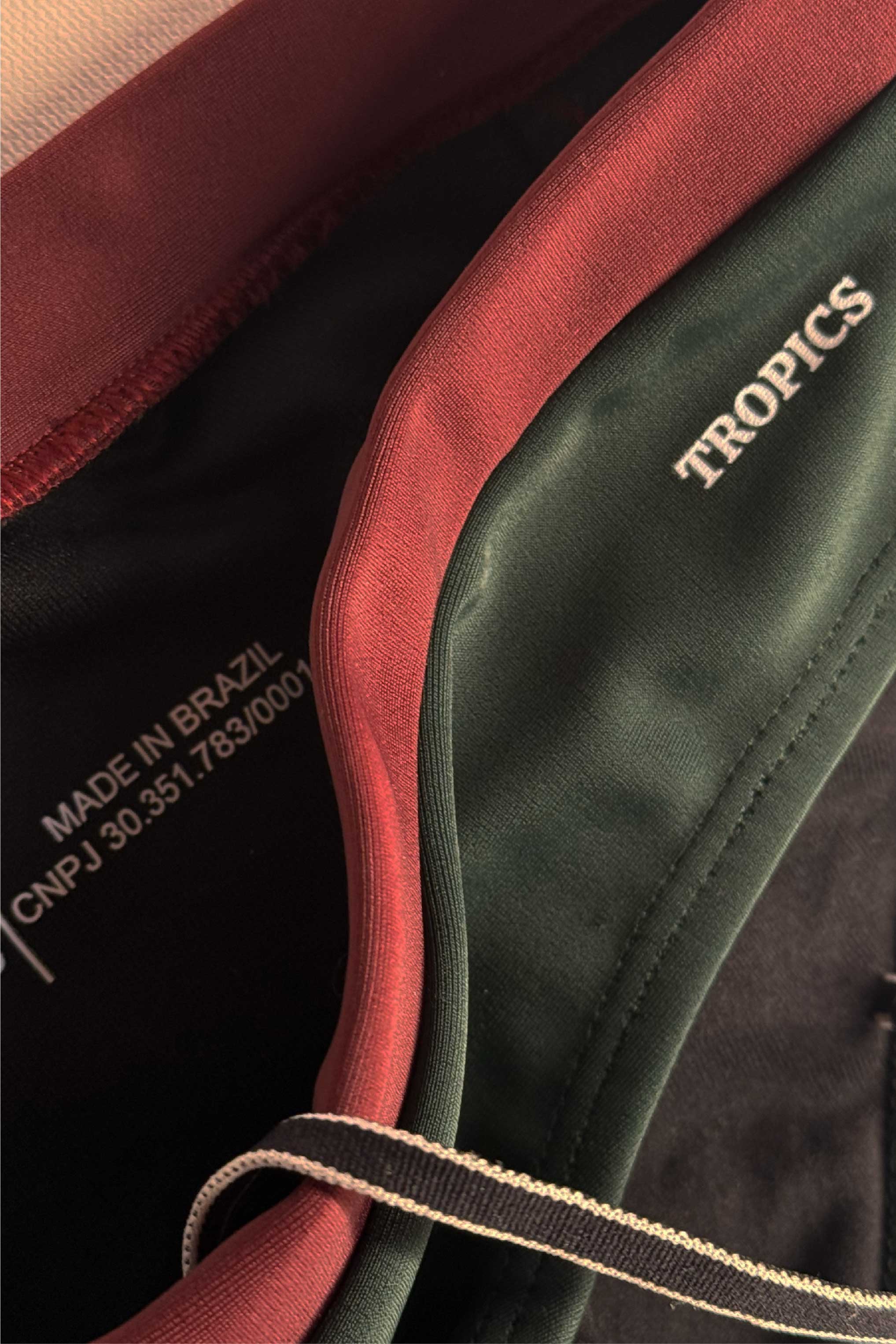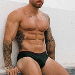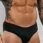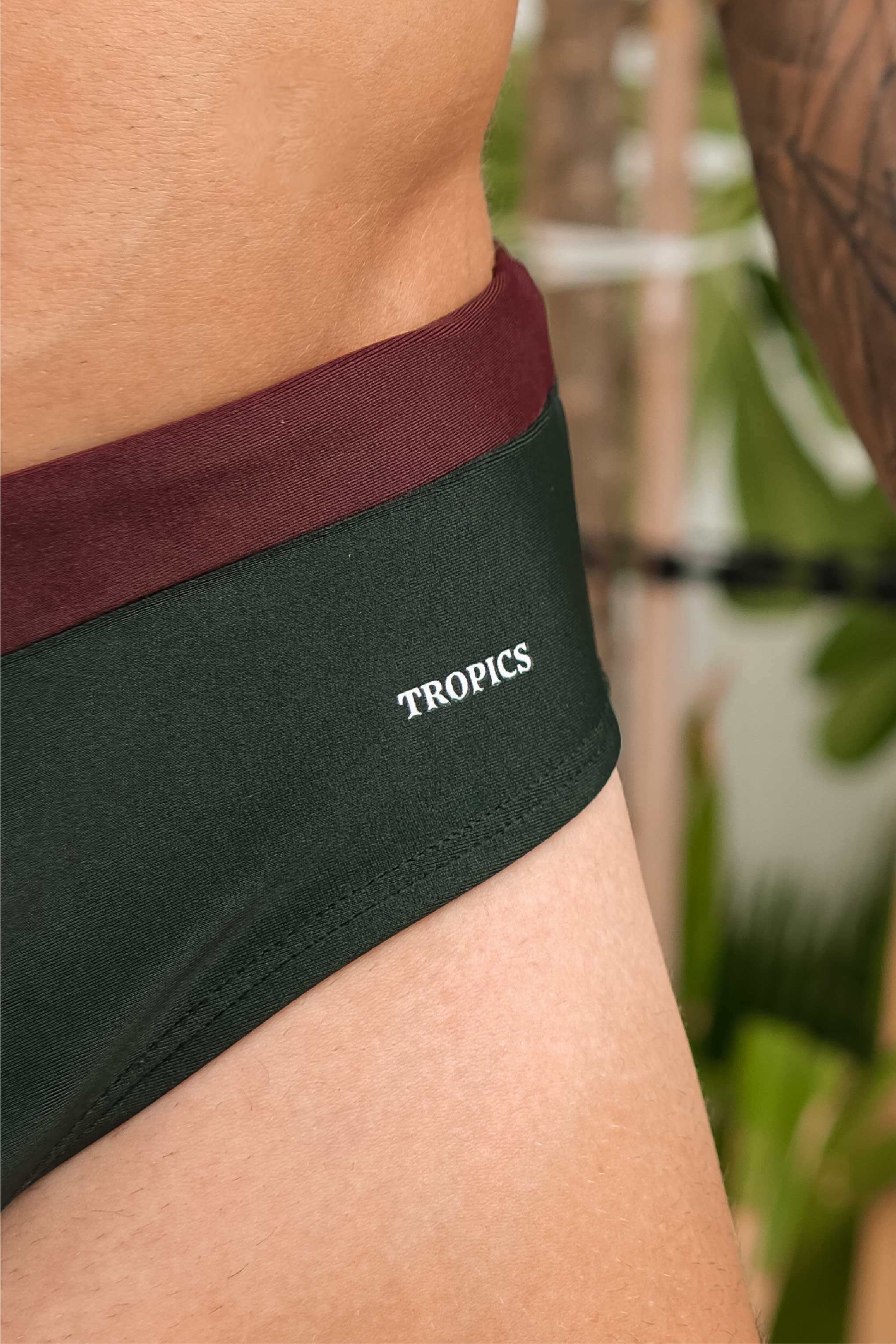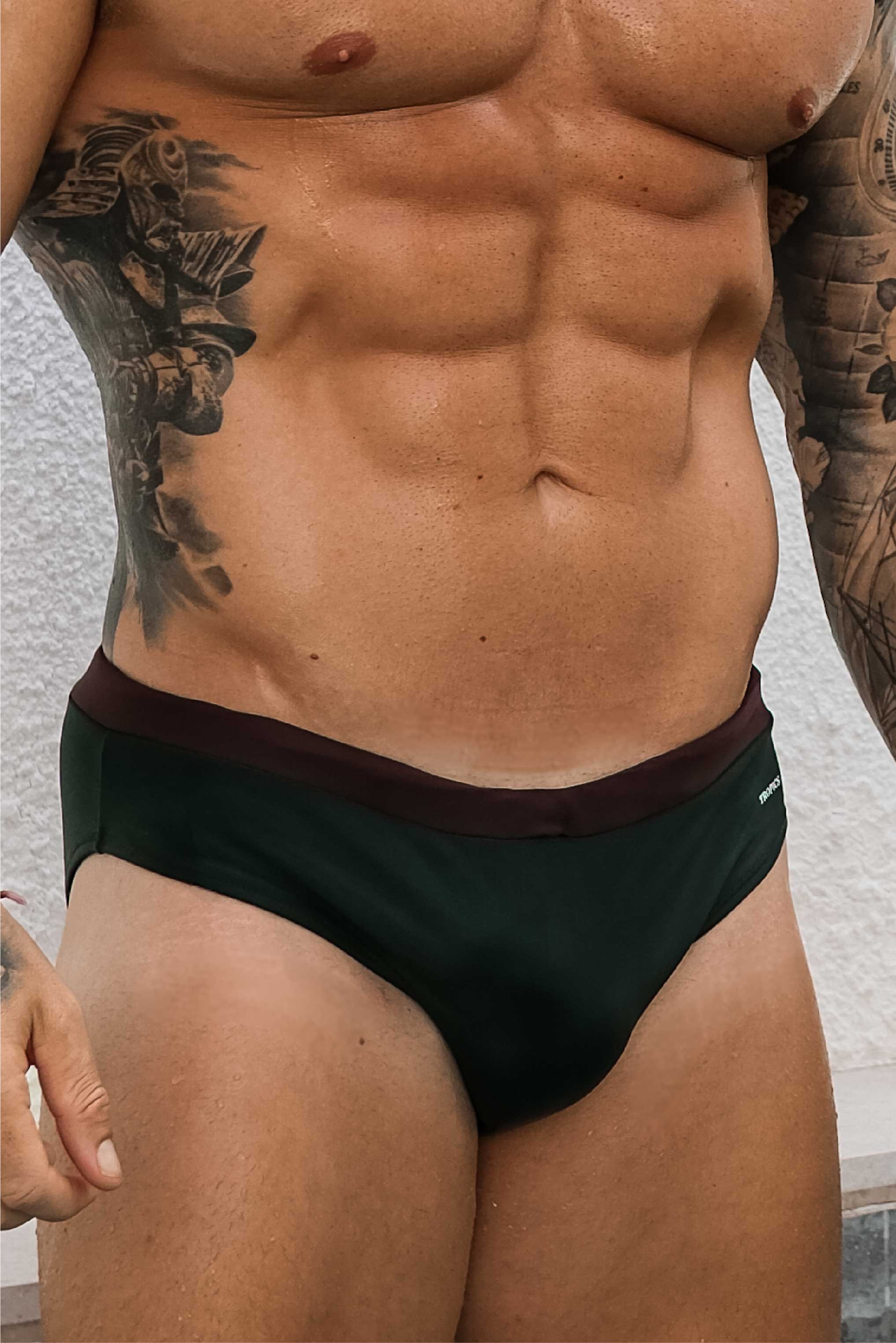 The Montego Brief features a refined deep green hue accented by an elegant red wine stripe along the top. Crafted from lightweight, high-quality material, it offers a sophisticated and noble feel, combining comfort with a distinguished aesthetic for those seeking understated luxury in swimwear.